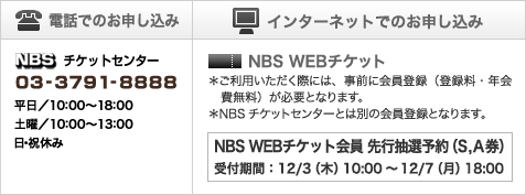 財団法人日本舞台芸術振興会 NBSチケットセンター 03-3791-8888 (平日10:00〜18:00、土曜10:00〜13:00、日祝休)