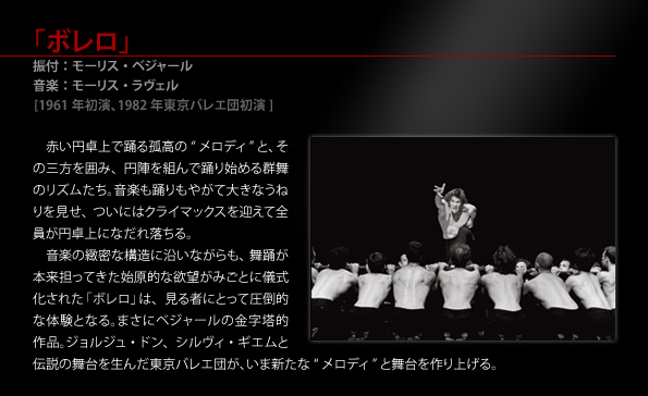 振付:モーリス・ベジャール 音楽:モーリス・ラヴェル [1961年初演、1982年東京バレエ団初演] 赤い円卓上で踊る孤高の“メロディ”と、その三方を囲み、円陣を組んで踊り始める群舞のリズムたち。音楽も踊りもやがて大きなうねりを見せ、ついにはクライマックスを迎えて全員が円卓上になだれ落ちる。 音楽の緻密な構造に沿いながらも、舞踊が本来担ってきた始原的な欲望がみごとに儀式化された「ボレロ」は、見る者にとって圧倒的な体験となる。まさにベジャールの金字塔的作品。ジョルジュ・ドン、シルヴィ・ギエムと伝説の舞台を生んだ東京バレエ団が、いま新たな“メロディ”と舞台を作り上げる。