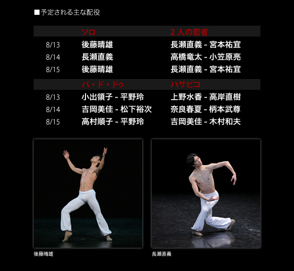 ソロ 2人の若者 8/13(金) 後藤晴雄 長瀬直義-宮本祐宜 8/14(土) 長瀬直義 高橋竜太-小笠原亮 8/15(日) 後藤晴雄 長瀬直義-宮本祐宜 パ・ド・ドゥ ハサピコ 8/13(金) 小出領子-平野玲 上野水香-高岸直樹 8/14(土) 吉岡美佳-松下裕次 奈良春夏-柄本武尊 8/15(日) 高村順子-平野玲 吉岡美佳-木村和夫