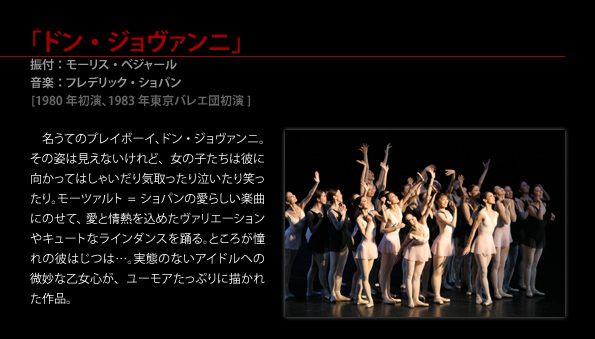 振付:モーリス・ベジャール 音楽:フレデリック・ショパン [1980年初演、1983年東京バレエ団初演] 名うてのプレイボーイ、ドン・ジョヴァンニ。その姿は見えないけれど、女の子たちは彼に向かってはしゃいだり気取ったり泣いたり笑ったり。モーツァルト=ショパンの愛らしい楽曲にのせて、愛と情熱を込めたヴァリエーションやキュートなラインダンスを踊る。ところが憧れの彼はじつは…。実態のないアイドルへの微妙な乙女心が、ユーモアたっぷりに描かれた作品。