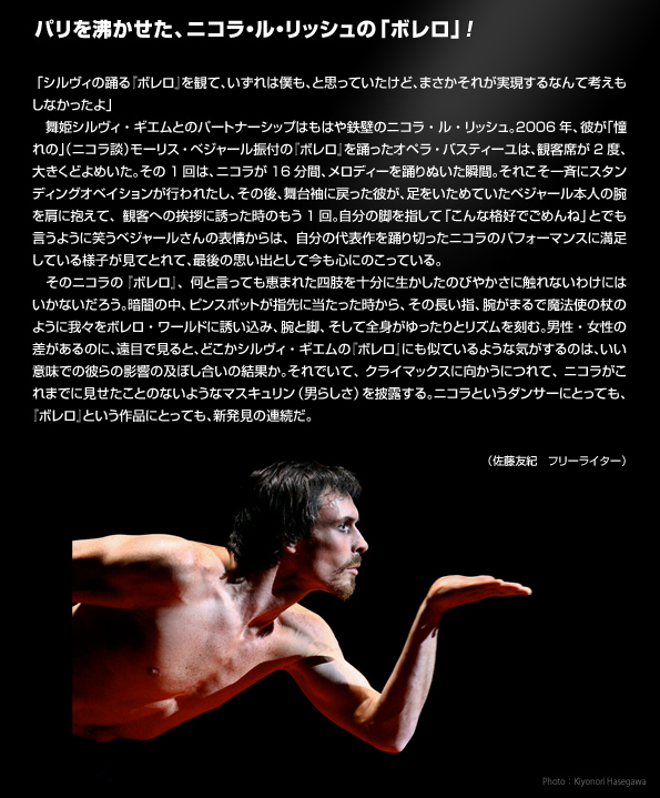 「シルヴィの踊る『ボレロ』を観て、いずれは僕も、と思っていたけど、まさかそれが実現するなんて考えもしなかったよ」 舞姫シルヴィ・ギエムとのパートナーシップはもはや鉄壁のニコラ・ル・リッシュ。2006年、彼が「憧れの」(ニコラ談)モーリス・ベジャール振付の『ボレロ』を踊ったオペラ・バスティーユは、観客席が2度、大きくどよめいた。その1回は、ニコラが16分間、メロディーを踊りぬいた瞬間。それこそ一斉にスタンディングオベイションが行われたし、その後、舞台袖に戻った彼が、足をいためていたベジャール本人の腕を肩に抱えて、観客への挨拶に誘った時のもう1回。自分の脚を指して「こんな格好でごめんね」とでも言うように笑うベジャールさんの表情からは、自分の代表作を踊り切ったニコラのパフォーマンスに満足している様子が見てとれて、最後の思い出として今も心にのこっている。 そのニコラの『ボレロ』、何と言っても恵まれた四肢を十分に生かしたのびやかさに触れないわけにはいかないだろう。暗闇の中、ピンスポットが指先に当たった時から、その長い指、腕がまるで魔法使の杖のように我々をボレロ・ワールドに誘い込み、腕と脚、そして全身がゆったりとリズムを刻む。男性・女性の差があるのに、遠目で見ると、どこかシルヴィ・ギエムの『ボレロ』にも似ているような気がするのは、いい意味での彼らの影響の及ぼし合いの結果か。それでいて、クライマックスに向かうにつれて、ニコラがこれまでに見せたことのないようなマスキュリン(男らしさ)を披露する。ニコラというダンサーにとっても、『ボレロ』という作品にとっても、新発見の連続だ。 (佐藤友紀 フリーライター)