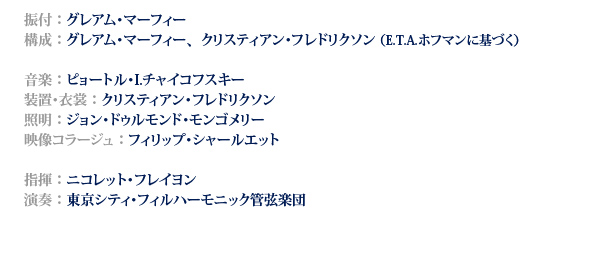 振付 : グレアム・マーフィー 構成 : グレアム・マーフィー、クリスティアン・フレドリクソン (E.T.A.ホフマンに基づく) 音楽 : ピョートル・I.チャイコフスキー 装置・衣裳 : クリスティアン・フレドリクソン 照明 : ジョン・ドゥルモンド・モンゴメリー 映像コラージュ : フィリップ・シャールエット 指揮 : ニコレット・フレイヨン 演奏 : 東京シティ・フィルハーモニック管弦楽団