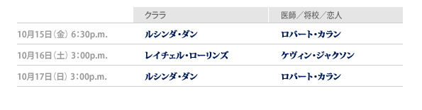 クララ 医師/将校/恋人 10月15日(金) 6:30p.m. ルシンダ・ダン ロバート・カラン 10月16日(土) 3:00p.m. レイチェル・ローリンズ ケヴィン・ジャクソン 10月17日(日) 3:00p.m. ルシンダ・ダン ロバート・カラン