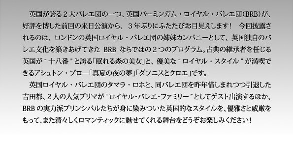 英国ロイヤル・バレエ団のタマラ・ロホと、同バレエ団を昨年惜しまれつつ引退した吉田都、2人の人気プリマが“ロイヤル・バレエ・ファミリー”としてゲスト出演するほか、BRBの実力派プリンシパルたちが身に染みついた英国的なスタイルを、優雅さと威厳をもって、また清々しくロマンティックに魅せてくれる舞台をどうぞお楽しみください!
