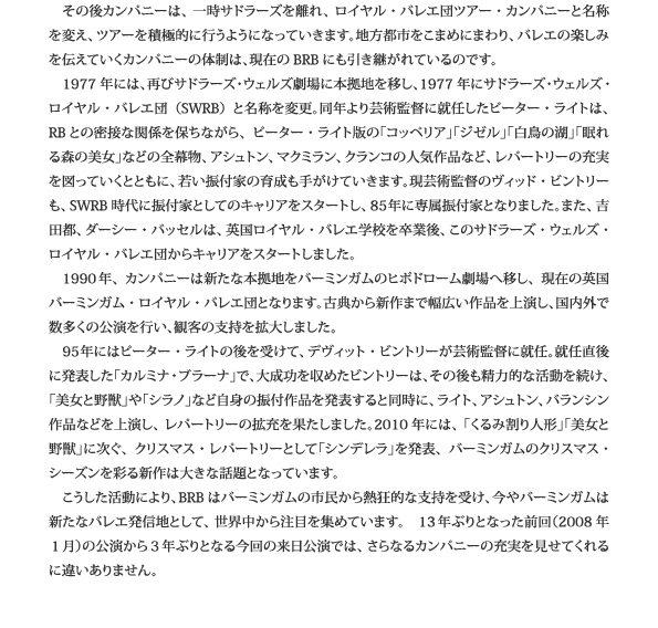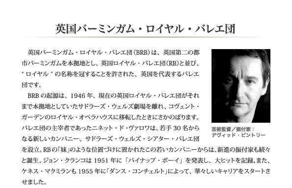 英国バーミンガム・ロイヤル・バレエ団(BRB)は、英国第二の都市バーミンガムを本拠地とし、英国ロイヤル・バレエ団(RB)と並び、“ロイヤル”の名称を冠することを許された、英国を代表するバレエ団です。 BRBの起源は、1946年、現在の英国ロイヤル・バレエ団がそれまで本拠地としていたサドラーズ・ウェルズ劇場を離れ、コヴェント・ガーデンのロイヤル・オペラハウスに移転したときにさかのぼります。バレエ団の主宰者であったニネット・ド・ヴァロワは、若手30名からなる新しいカンパニー、サドラーズ・ウェルズ・シアター・バレエ団を設立。RBの「妹」のような位置づけに置かれたこの若いカンパニーからは、新進の振付家も続々と誕生。ジョン・クランコは1951年に「パイナップ・ボーイ」を発表し、大ヒットを記録。また、ケネス・マクミランも1955年に「ダンス・コンチェルト」によって、華々しいキャリアをスタートさせました。 その後カンパニーは、一時サドラーズを離れ、ロイヤル・バレエ団ツアー・カンパニーと名称を変え、ツアーを積極的に行うようになっていきます。地方都市をこまめにまわり、バレエの楽しみを伝えていくカンパニーの体制は、現在のBRBにも引き継がれているのです。 1977年には、再びサドラーズ・ウェルズ劇場に本拠地を移し、1977年にサドラーズ・ウェルズ・ロイヤル・バレエ団(SWRB)と名称を変更。同年より芸術監督に就任したピーター・ライトは、RBとの密接な関係を保ちながら、ピーター・ライト版の「コッペリア」「ジゼル」「白鳥の湖」「眠れる森の美女」などの全幕物、アシュトン、マクミラン、クランコの人気作品など、レパートリーの充実を図っていくとともに、若い振付家の育成も手がけていきます。現芸術監督のヴィッド・ビントリーも、SWRB時代に振付家としてのキャリアをスタートし、85年に専属振付家となりました。また、吉田都、ダーシー・バッセルは、英国ロイヤル・バレエ学校を卒業後、このサドラーズ・ウェルズ・ロイヤル・バレエ団からキャリアをスタートしました。 1990年、カンパニーは新たな本拠地をバーミンガムのヒポドローム劇場へ移し、現在の英国バーミンガム・ロイヤル・バレエ団となります。古典から新作まで幅広い作品を上演し、国内外で数多くの公演をオコアに、観客の支持を拡大しました。 95年にはピーター・ライトの後を受けて、デヴィット・ビントリーが芸術監督に就任。就任直後に発表した「カルミナ・ブラーナ」で、大成功を収めたビントリーは、その後も精力的な活動を続け、「美女と野獣」や「シラノ」など自身の振付作品を発表すると同時に、ライト、アシュトン、バランシン作品などを上演し、レパートリーの拡充を果たしました。2010年には、「くるみ割り人形」「美女と野獣」に次ぐ、クリスマス・レパートリーとして「シンデレラ」を発表、バーミンガムのクリスマス・シーズンを彩る新たな名作は大きな話題となっています。 こうした活動により、BRBはバーミンガムの市民から熱狂的な支持を受け、今やバーミンガムは新たなバレエ発信地として、世界中から注目を集めています。 13年ぶりとなった前回(2008年1月)の公演から3年ぶりとなる今回の来日公演では、さらなるカンパニーの充実ぶりを見せてくれるに違いありません。