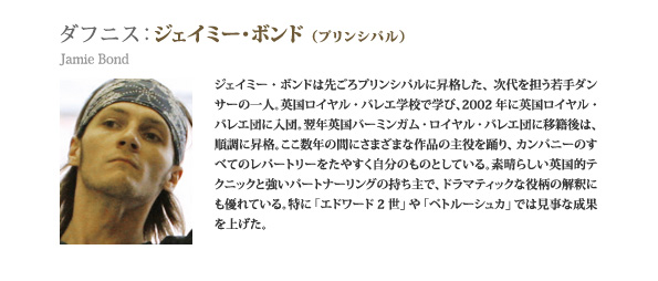 ジェイミー・ボンドは先ごろプリンシパルに昇格した、次代を担う若手ダンサーの一人。英国ロイヤル・バレエ学校で学び、2002年に英国ロイヤル・バレエ団に入団。翌年英国バーミンガム・ロイヤル・バレエ団に移籍後は、順調に昇格。ここ数年の間にさまざまな作品の主役を踊り、カンパニーのすべてのレパートリーをたやすく自分のものとしている。素晴らしい英国的テクニックと強いパートナーリングの持ち主で、ドラマティックな役柄の解釈にも優れている。特に「エドワード2世」や「ペトルーシュカ」では見事な成果を上げた。