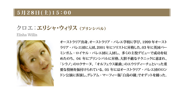 オーストラリア出身。オーストラリア・バレエ学校に学び、1999年オーストラリア・バレエ団に入団、2001年にソリストに昇格した。03年に英国バーミンガム・ロイヤル・バレエ団に入団し、多くの主役デビューで成功を収めたのち、04年にプリンシパルに昇格。大胆不敵なテクニックに恵まれ、「シラノ」のロクサーヌ、「オルフェウス組曲」のエウリディーチェといった重要な役柄を振付けられている。05年にはオーストラリア・バレエ団のロンドン公演に客演し、グレアム・マーフィー版「白鳥の湖」でオデットを踊った。