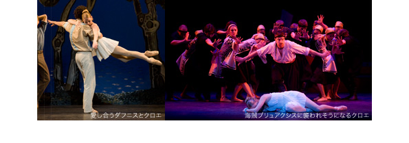 左)愛し合うダフニスとクロエ 右)海賊ブリュアクシスに襲われそうになるクロエ