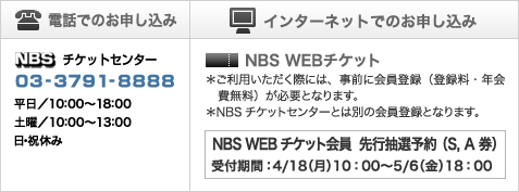 財団法人日本舞台芸術振興会 NBSチケットセンター 03-3791-8888 (平日10:00〜18:00、土曜10:00〜13:00、日祝休)