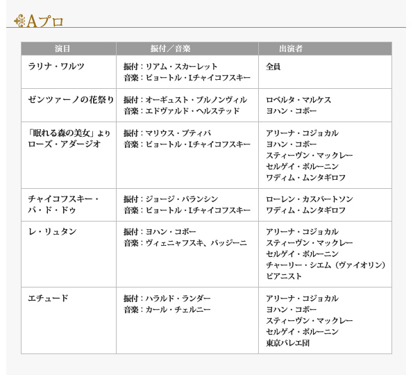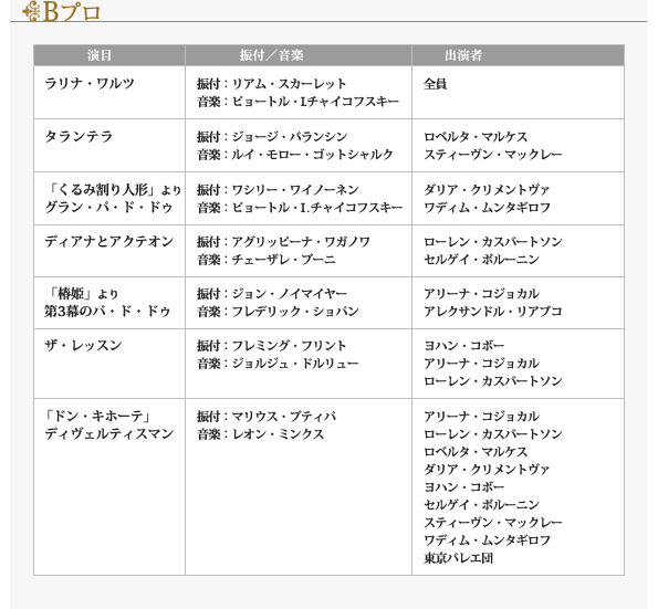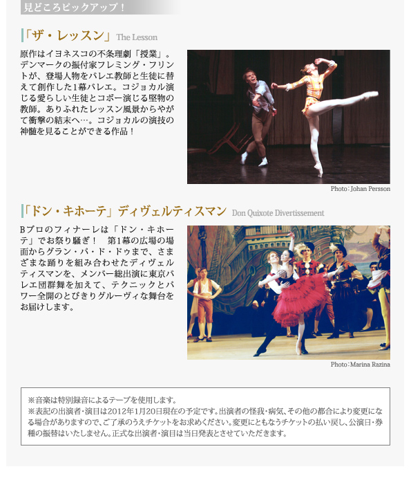 ※音楽は特別録音によるテープを使用します。 ※表記の出演者・演目は2011年10月19日現在の予定です。出演者の怪我・病気、その他の都合により変更になる場合がありますので、ご了承のうえチケットをお求めください。変更にともなうチケットの払い戻し、公演日・券種の振替はいたしません。正式な出演者・演目は当日発表とさせていただきます。