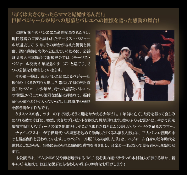 その第一弾は、東京バレエ団によるベジャール振付の「くるみ割り人形」。7歳にして母の死と直面したベジャール少年が、母への思慕とバレエへの憧憬という二つの強烈な感情に押されて、振付家への道へと分け入っていった、巨匠誕生の秘話を解き明かす作品です。