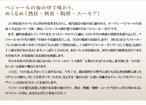 ベジャールが選び表現した豊かな音楽の海の中で、熱狂・興奮・陶酔・ユーモアをたっぷりと味わえるこのベジャール祭に、あなたもぜひご参加ください!