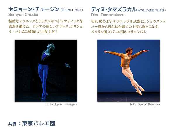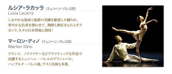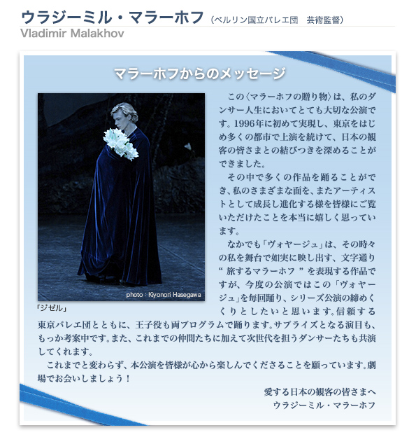 ウラジーミル・マラーホフ (ベルリン国立バレエ団 芸術監督) Vladimir Malakhov マラーホフからのメッセージ この〈マラーホフの贈り物〉は、私のダンサー人生においてとても大切な公演です。1996年に初めて実現し、東京をはじめ多くの都市で上演を続けて、日本の観客の皆さまとの結びつきを深めることができました。 その中で多くの作品を踊ることができ、私のさまざまな面を、またアーティストとして成長し進化する様を皆様にご覧いただけたことを本当に嬉しく思っています。 なかでも「ヴォヤージュ」は、その時々の私を舞台で如実に映し出す、文字通り“旅するマラーホフ”を表現する作品ですが、今度の公演ではこの「ヴォヤージュ」を毎回踊り、シリーズ公演の締めくくりとしたいと思います。信頼する 東京バレエ団とともに、王子役も両プログラムで踊ります。サプライズとなる演目も、もっか考案中です。また、これまでの仲間たちに加えて次世代を担うダンサーたちも共演してくれます。 これまでと変わらず、本公演を皆様が心から楽しんでくださることを願っています。劇場でお会いしましょう! 愛する日本の観客の皆さまへ ウラジーミル・マラーホフ photo:Kiyonori Hasegawa マリア・アイシュヴァルト (シュツットガルト・バレエ団) Maria Eichwald 強いテクニックに加えて悲劇も喜劇も自在にこなす 演技力と存在感が舞台で強い求心力を放つ、シュツットガルトのトップ・プリマ。 マライン・ラドメーカー (シュツットガルト・バレエ団) Marijn Rademaker 長身、金髪の美しい容姿。シャープなダンスで胸に迫る情熱的な貴公子からスタイリッシュなコンテンポラリーまでを披露するシュツットガルトの貴公子。 ルシア・ラカッラ (ミュンヘン・バレエ団) Lucia Lacarra しなやかな肢体と抜群の美脚を駆使した踊りが、 華やかな色香を漂わせて、陶酔と熱狂をもたらすラカッラ。 久々の日本登場に期待! マーロン・ディノ Marlon Dino クランコ、ノイマイヤーなどドラマティックな作品で活躍する ミュンヘン・バレエのプリンシパル。 ハンブルク・バレエ他、ゲスト出演も多数。 ヤーナ・サレンコ (ベルリン国立バレエ団) Yana Salenko 小柄で愛らしい容姿と確かなテクニックに裏付けられた溌剌とした個性が、 観る者の心を晴れやかに。世界バレエフェスティバルでも活躍。 photo:Kiyonori Hasegawa オリガ・スミルノワ (ボリショイ・バレエ) Olga Smirnova バレエ学校時代から注目を浴びたボリショイ・バレエの美しき新鋭。 「ラ・バヤデール」「ファラオの娘」など次々と主演を成功させ、 時代を担うプリマと期待を集める。 photo:Damir Yusupov セミョーン・チュージン (ボリショイ・バレエ) Semyon Chudin 精緻なテクニックとリリカルかつドラマティックな表現を備えた、 ロシアの新しいプリンス。ボリショイ・バレエに移籍し注目度上昇! photo:Kiyonori Hasegawa ディヌ・タマズラカル (ベルリン国立バレエ団) Dinu Tamazlakaru 切れ味のよいテクニックを武器に、ショウストッパー役から 近年は全幕での主役も数々こなす、 ベルリン国立バレエ団のプリンシパル。 photo:Kiyonori Hasegawa