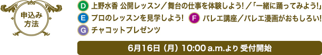 A 公 演 ≪有料≫ 東京バレエ団 『白鳥の湖』&『ボレロ』 A 公 演 ≪有料≫ 東京バレエ団 子どものためのバレエ 『ねむれる森の美女』 B パフォーマンス ≪有料≫ 東京バレエ学校 スクール・パフォーマンス C 上 映 ≪無料≫ 東京バレエ団 ジョン・ノイマイヤー振付『ロミオとジュリエット』映像上映会 D 体 験 ≪有料≫ 上野水香 公開レッスン ~オーロラ姫の振付の一部に挑戦!~ D 体 験 ≪無料≫ 一緒に踊ってみよう! D 体 験 ≪無料≫ 舞台の仕事を体験しよう! E 見 学 ≪無料≫ プロのレッスンを見学しよう! F 講 座 &トーク ≪無料≫ バレエ講座 バレエ漫画がおもしろい! G 特別企画 ≪有料≫ 『 白鳥の湖 』を踊ろう! チャコットプレゼンツ トゥシューズを知ろう!+ティアラをつくろう! G 特別企画 ≪無料≫ 新書館「ダンシン」プレゼンツ 英国ロイヤル・バレエ プリンシパル スティーヴン・マクレイと話そう! チャコットプレゼンツ お姫様になろう!