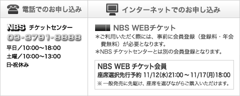 財団法人日本舞台芸術振興会 NBSチケットセンター 03-3791-8888 (平日10:00〜18:00、土曜10:00〜13:00、日祝休)