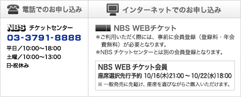 財団法人日本舞台芸術振興会 NBSチケットセンター 03-3791-8888 (平日10:00〜18:00、土曜10:00〜13:00、日祝休)