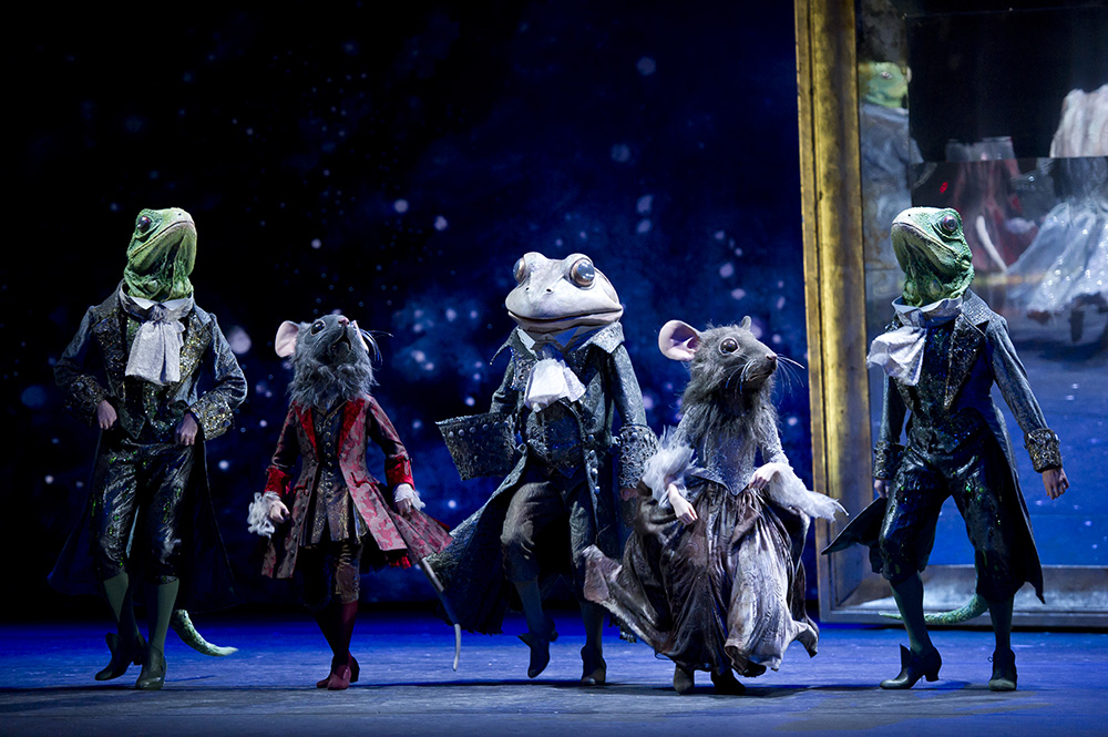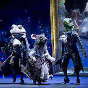 ビントリーが物語の核に据えたのは、「靴」。継母や義理の姉たちから酷い仕打ちを受けているシンデレラは第1幕、裸足で登場します。彼女の唯一の宝物は、亡き母の形見の舞踏会用の靴。優しい彼女は、物乞いの裸足の老女=仙女を気の毒に重い、これを差し出すのです。舞踏会では、この母の靴を履いて王子と踊り、舞台はこの上ない幸福感に包まれます。巨大時計が魔法の解ける時をダイナミックに告げると、物語はシンデレラと王子が愛を確認し合う感動のフィナーレへ。仙女の魔法で登場するカエルの御者、トカゲの従者、ネズミの小姓ら、マスクを被ったキャラクターたちのコミカルな踊りも、英国バレエならではの楽しい見どころ!