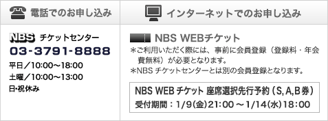 財団法人日本舞台芸術振興会 NBSチケットセンター 03-3791-8888 (平日10:00〜18:00、土曜10:00〜13:00、日祝休)