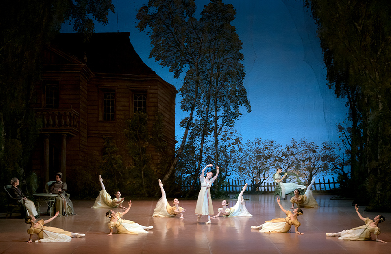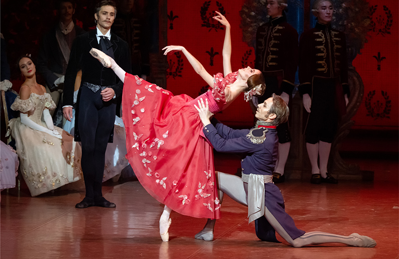 1820年代のロシア。素朴な人々が暮らす田舎と華やかな帝都ペテルブルクを舞台に、ロシアの理想の女性と称えられる誠実なタチヤーナと憂愁の貴公子オネーギンの悲劇的な恋のゆくえがチャイコフスキーの同名オペラとは別の音楽を使って描かれます。 タチヤーナとオネーギンをめぐる出来事がまるで映画を見るように流暢に進んでいくなか、現れるのは全編の白眉ともいえる二つの鮮烈な場面。オネーギンを慕うタチヤーナの初恋の高まりを描く第1幕最後の“鏡のパ・ド・ドゥ”と、二人のすれ違ってしまった恋の葛藤を表現する最終場の“手紙のパ・ド・ドゥ”はこれぞドラマティック・バレエといえる名シーンです。