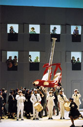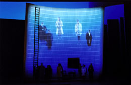 トーマス・ラングホフによる演出は、「いまここで起こっている出来事」として、聴衆に物語を受け取らせます。モバイルや携帯電話時代を反映させた現代的ステージで舞台は展開していきます。隣街からやってきた乙女たちはチアリーダーふう、歌合戦の場は大画面で中継され、ナチスに悪用された最後の場面では、右翼フーリガンが登場してきます。いかにも過激な舞台といったイメージが膨らみますが、演出家のラングホフは演劇で腕を磨いたベテラン、この作品がもつ芸術としての本質は決して軽んじられることはありません。新旧の価値観の在り方を問うこのオペラのテーマは、巨大な装置と効果的な照明によるモダンな雰囲気をもつこの舞台では、より身近に捉えられることでしょう。