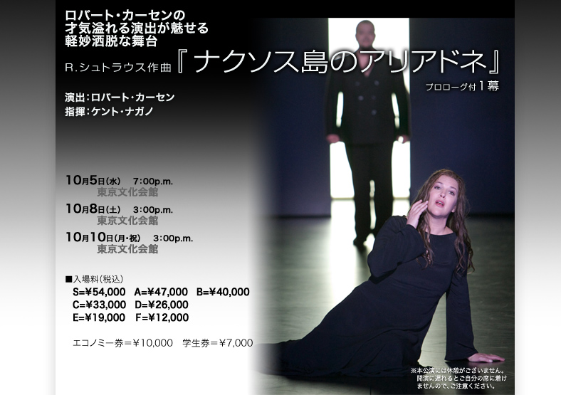 ※表記の配役は2010年6月10日現在の予定です。病気や怪我などのやむを得ない事情により出演者が変更になる場合があります。今回の引越し公演においても、予定されていた出演者がやむを得ず出演できない場合、(指揮者、出演の歌手であっても)代役を立てて上演することになっておりますので、あらかじめご了承ください。出演者変更にともなうチケットの払い戻し、公演日・券種の変更はお受けできません。最終出演者は当日発表とさせていただきます。