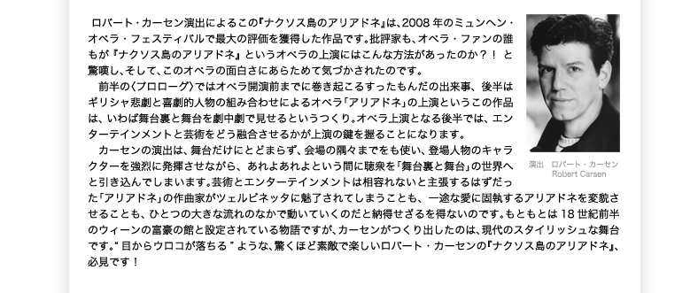 ロバート・カーセン演出によるこの『ナクソス島のアリアドネ』は、2008年のミュンヘン・オペラ・フェスティバルで最大の評価を獲得した作品です。批評家も、オペラ・ファンの誰もが『ナクソス島のアリアドネ』というオペラの上演にはこんな方法があったのか?! と驚嘆し、そして、このオペラの面白さにあらためて気づかされたのです。 前半の〈プロローグ〉ではオペラ開演前までに巻き起こるすったもんだの出来事、後半はギリシャ悲劇と喜劇的人物の組み合わせによるオペラ「アリアドネ」の上演というこの作品は、いわば舞台裏と舞台を劇中劇で見せるというつくり。オペラ上演となる後半では、エンターテインメントと芸術をどう融合させるかが上演の鍵を握ることになります。 カーセンの演出は、舞台だけにとどまらず、会場の隅々までをも使い、登場人物のキャラクターを強烈に発揮させながら、あれよあれよという間に聴衆を「舞台裏と舞台」の世界へと引き込んでしまいます。芸術とエンターテインメントは相容れないと主張するはずだった「アリアドネ」の作曲家がツェルビネッタに魅了されてしまうことも、一途な愛に固執するアリアドネを変貌させることも、ひとつの大きな流れのなかで動いていくのだと納得せざるを得ないのです。もともとは18世紀前半のウィーンの富豪の館と設定されている物語ですが、カーセンがつくり出したのは、現代のスタイリッシュな舞台です。"目からウロコが落ちる"ような、驚くほど素敵で楽しいロバート・カーセンの『ナクソス島のアリアドネ』、必見です!