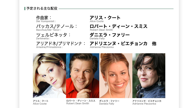 存在感バッチリ、華のあるアドリエンヌ・ピエチョンカはこのプリマ・ドンナ役の申し子のよう。みずみずしい歌声、変貌する女アリアドネの表現力もみどころ。バッカス役はワーグナー・テノールの系統に属す英雄的な人物だから、ワーグナーの諸役で美声テノールと評価の高いロバート・ディーン・スミスへの期待大。この演出のキーパーソン、ツェルビネッタを演じるダニエラ・ファリーは、ウィーン・フォルクスオーパーで腕を磨き、近年はヨーロッパ各地で大注目を集めている。この役柄に何よりも必要なコケティッシュな魅力の持ち主。