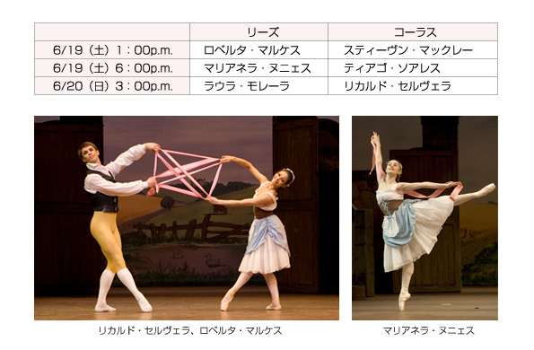 リーズ: マリアネラ・ヌニェス(プリンシパル) Marianela Nuñez ブエノスアイレスに生まれ、コロン劇場バレエ学校で学ぶ。マキシミリアーノ・グエラとともにコロン劇場のツアーで世界を回る。1998年ロイヤル・バレエ学校に入学。99年ロイヤル・バレエ団に入団し、2002年プリンシパルに昇格。レパートリーに、『ロミオとジュリエット』のジュリエット、『うたかたの恋』のミッツィ・カスパー、 『リーズの結婚』のリーズ、『シルヴィア』のシルヴィア、『ドン・キホーテ』のキトリ、『コッペリア』のスワニルダ、『くるみ割り人形』の金平糖の精、『ラ・バヤデール』のニキヤとガムザッティ、『眠れる森の美女』のオーロラ姫とリラの精、『オネーギン』のオリガ、『ジゼル』のミルタ、『ジュエルズ』のダイヤモンド、『チャイコフスキー・パ・ド・ドゥ』、『イン・ザ・ミドル・サムホワット・エレヴェイテッド』、『モノトーンズ』、『アゴン』、『この家は燃える』、『葉は色あせて』、『シンフォニエッタ』、『四つの気質』、『ランデヴー』、『女王に捧ぐ』など。初演作品に『超高速ダンス』、『四季』、『7つの大罪』、『リーメン』などがある。