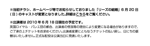 リーズ : ロベルタ・マルケス(プリンシパル) Roberta Marquez ブラジル生まれ。マリア・アレヴェワ国立バレエ学校で訓練を受け、1994年リオ・デ・ジャネイロ市民劇場バレエ団に入団し、2002年プリンシパルに昇格。ブラジルでのレパートリーには『眠れる森の美女』のオーロラ姫、『白鳥の湖』のオデット/オディール、『ラ・バヤデール』のニキヤ、『コッペリア』のスワニルダ、『ロミオとジュリエット』のジュリエット、『じゃじゃ馬馴らし』のキャタリーナ、『くるみ割り人形』の金平糖の精、『白の組曲』、『ジゼル』のジゼルなどがある。01年リオ・デ・ジャネイロ・ダンス賞の最優秀ダンサー賞、01年モスクワ国際バレエ・コンクールの銀賞を受賞。04年ロイヤル・バレエ団にプリンシパルとして入団し、『白鳥の湖』のオデット/オディール、『結婚披露宴』の花嫁、『マノン』と『シンデレラ』のタイトル・ロール、『ロミオとジュリエット』のジュリエット、『リーズの結婚』のリーズ、『くるみ割り人形』の金平糖の精、『眠れる森の美女』のオーロラ姫、『ラ・シルフィード』のシルフィード、『ザ・レッスン』生徒、『コッペリア』のスワニルダ、『オネーギン』タチアナ、『シンフォニック・ヴァリエーション』などを踊っている。