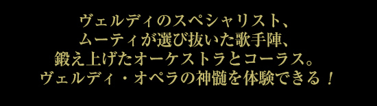 ヴェルディのスペシャリスト、ムーティが選び抜いた歌手陣、鍛え上げたオーケストラとコーラス。ヴェルディ・オペラの神髄を体験できる!