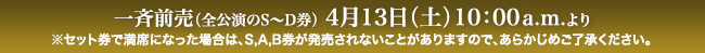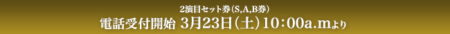 2演目セット券(S,A,B券) 電話受付開始 3月23日(土)10:00a.m.より 03-3791-8888 ■セット券はNBSチケットセンターで電話によってのみ受付いたします。 一斉前売(全公演のS~D券)4月13日(土)10:00a.m.より ※セット券で満席になった場合は、S,A,B券が発売されないことがありますので、あらかじめご了承ください。