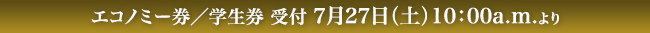 エコノミー券/学生券 受付 7月27日(土)10:00a.m.より ■エコノミー券はイープラスのみで受付。お一人様につき1枚。プレオーダー7/18(木)~7/24(水) 第2次発売 7月20日(土)10:00a.m.より 各前売所からの回収分等を集めて、NBSとイープラスのみで第2次発売いたします。一斉前売でチケットが入手できなかった方は、この機会にいま一度お問合せください。(公演日、券種によりご用意できない場合がありますので、あらかじめご了承ください。) |