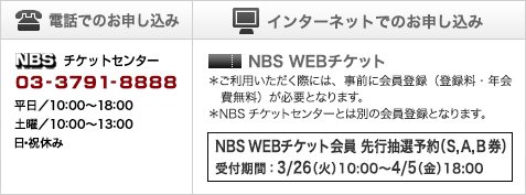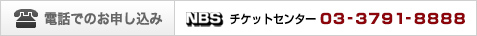 ●NBSチケットセンター(電話予約)ではお申し込みが殺到することが予想される発売日初日から1週間ほどは、座席のご指定は承れません。お申込みいただいた後の変更はお受け出来ません。またお支払い期限までにご入金が確認できない場合は、お申込みは無効とさせていただきます。 |