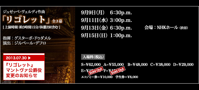 ●入場券ご購入にあたり、あらかじめご了承ください。表記の出演者は2013年7月30日現在の予定です。病気や怪我などのやむを得ない事情により出演者が変更になる場合があります。その場合、指揮者、主役の歌手であっても、代役を立てて上演することになっておりますので、あらかじめご了承ください。出演者変更にともなうチケットの払い戻し、公演日・券種の変更はお受けできません。最終出演者は当日発表とさせていただきます。 |