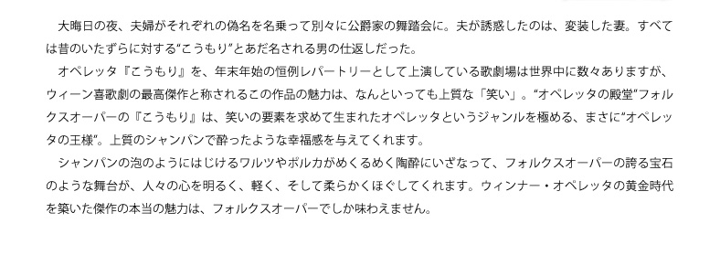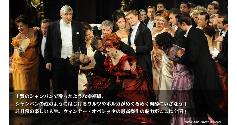 大晦日の夜、夫婦がそれぞれの偽名を名乗って別々に公爵家の舞踏会に。夫が誘惑したのは、変装した妻。すべては昔のいたずらに対する“こうもり”とあだ名される男の仕返しだった。 オペレッタ『こうもり』を、年末年始の恒例レパートリーとして上演している歌劇場は世界中に数々ありますが、ウィーン喜歌劇の最高傑作と称されるこの作品の魅力は、なんといっても上質な「笑い」。“オペレッタの殿堂”フォルクスオーパーの『こうもり』は、笑いの要素を求めて生まれたオペレッタというジャンルを極める、まさに“オペレッタの王様”。上質のシャンパンで酔ったような幸福感を与えてくれます。 シャンパンの泡のようにはじけるワルツやポルカがめくるめく陶酔にいざなって、フォルクスオーパーの誇る宝石のような舞台が、人々の心を明るく、軽く、そして柔らかくほぐしてくれます。ウィンナー・オペレッタの黄金時代を築いた傑作の本当の魅力は、フォルクスオーパーでしか味わえません。