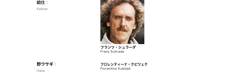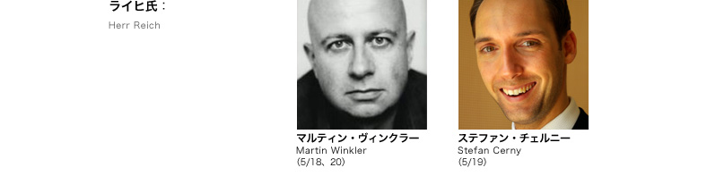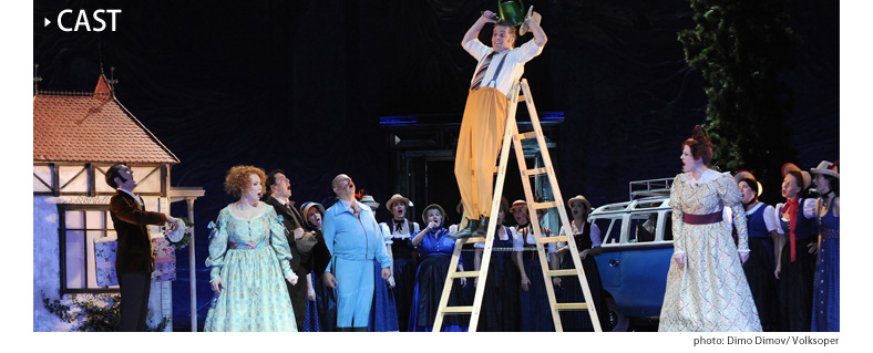 フルート夫人:Frau Fluth : ジェニファー・オローリン(5/18,20) Jennifer O’Loughlin エリーザベト・フレヒル(5/19) Elisabeth Flechl ライヒ夫人:Frau Reich :アレクサンドラ・クルーゼ(5/18,20) Alexandra Kloose スーリエ・ジラルディ(5/19) Sulie Girardi アンナ:Anna Reich :ベルナルダ・ボブロ(5/18,20) Bernarda Bobro ベアーテ・リッター(5/19) Beate Ritter フルート氏:Herr Fluth :モルテン・フランク・ラーセン(5/18,20) Morten Frank Larsen マティアス・ハウスマン(5/19) Matthias Hausmann ライヒ氏:Herr Reich :Mマルティン・ヴィンクラー(5/18,20) artin Winkler ステファン・チェンルニー(5/19) Stefan Cerny ファルスタッフ:フランツ・ハヴラタ Sir John Falstaff :Franz Hawlata フェントン:Fenton :ダニエル・ベーレ(5/18,20) Daniel Behle ユンホー・ヨウ(5/19) JunHo You シュペルリヒ:Junker Spärlich : トーマス・ジグヴァルド(5/18,20)Thomas Sigwald カール=ミヒャエル・エブナー(5/19) Karl-Michael Ebner カーユス博士:Dr.Cajus :マルコ・ディ・サピア(5/18,20) Marco Di Sapia ミヒャエル・ハヴリチェク(5/19) Michael Havlicek 給仕:Kellner:フランツ・シュラーダ Franz Suhrada 野ウサギ:Hase :Fフロレンティーナ・クビツェク lorentina Kubizek