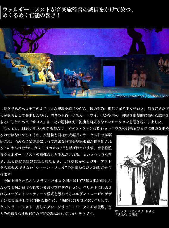 継父であるヘロデ王のよこしまな視線を感じながら、彼の望みに応じて踊る王女サロメ。踊り終えた彼女が褒美として要求したのは、聖者の生首…オスカー・ワイルドが聖書の一挿話を衝撃的に描いた戯曲をもとにしたオペラ『サロメ』は、その題材ゆえに初演当時大きなセンセーションを巻き起こしました。 もっとも、初演から100年余を経た今、オペラ・ファンはR.シュトラウスの音楽そのものに魅力を求めるのではないでしょうか。交響詩と同様の大編成のオーケストラが駆使され、巧みな音楽書法によって濃密な官能美や緊張感が描き出されるこのオペラは“オーケストラのオペラ”と呼ばれています。音楽総監督ウェルザー=メストの指揮のもと生みだされる、匂い立つような響き、息を飲む緊張感に包まれたとき、これが世界のどのオーケストラも真似のできない“ウィーン・フィル”の神髄なのだと納得させられます。 今回上演されるボレスラフ・バルロク演出は1972年以来40年にわたって上演が続けられている長寿プロダクション。クリムトに代表されるユーゲントシュティール様式を思わせるユルゲン・ローゼのデザインによる美しく官能的な舞台に、“新時代のサロメ歌い”として、ウェルザー=メスト一押しのグン=ブリット・バークミンが登場。音と色の織りなす極彩色の官能の海に溺れてしまいそうです。