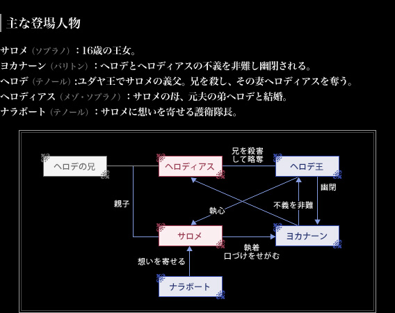 サロメ(ソプラノ):16歳の王女。 ヨカナーン(バリトン):ヘロデとヘロディアスの不義を非難し幽閉される。 ヘロデ(テノール):ユダヤ王でサロメの義父。兄を殺し、その妻ヘロディアスを奪う。 ヘロディアス(メゾ・ソプラノ):サロメの母、元夫の弟ヘロデと結婚。 ナラボート(テノール):サロメに想いを寄せる護衛隊長。