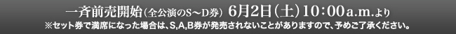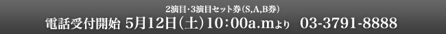 各前売所からの回収分等を集めて、NBSとイープラスのみで第2次発売いたします。一斉前売でチケットが入手できなかった方は、この機会にいま一度お問合せください。(公演日、券種によりご用意できない場合がありますので、あらかじめご了承ください。)