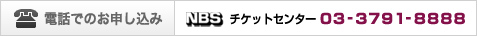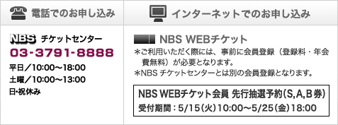 公益財団法人日本舞台芸術振興会NBSチケットセンター:03-3791-8888(平日10:00〜18:00、土曜10:00〜13:00、日祝休)