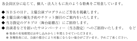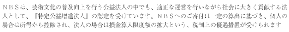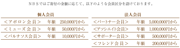 そこでNBSでは2005年、文部科学大臣より<特定公益増進法人>に認定されたことを機に、欧米の芸術団体のように本格的にファンドレイジング(寄付金募集)に取り組みを開始しました。わが国における舞台芸術を取り巻く環境は欧米に比べ貧困ですが、皆さまのお力添えを得て、NBSは欧米並みのオペラ・バレエの環境づくりをめざし、これまで以上にわが国の舞台芸術の普及向上に寄与したいと念願しております。