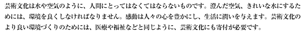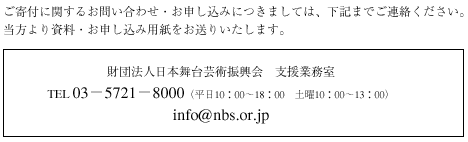 今後も、いっそう当財団の活動にご理解を賜るとともに、舞台芸術を愛する皆さまからのご支援を切にお願い申し上げます。 |