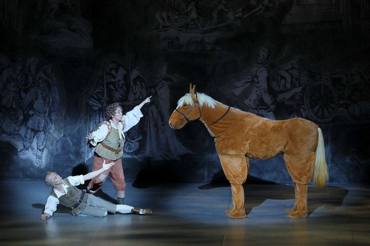 最大の特徴は、サンチョ・パンサ役のダンサーが台詞をしゃべり、物語の進行役を担うこと。憧れのドゥルシネア姫を探す旅に夢中のご主人さまに振り回され、ロシナンテの面倒もみながらの珍道中だが、自然な語りによって観る者を分かりやすく物語へと引き込む。やせ馬ロシナンテは着ぐるみの中に二人のダンサーが入って演じるが、闊歩する姿が可愛らしく、サンチョ・パンサの問いに対する反応も可笑しくて笑いを誘う。