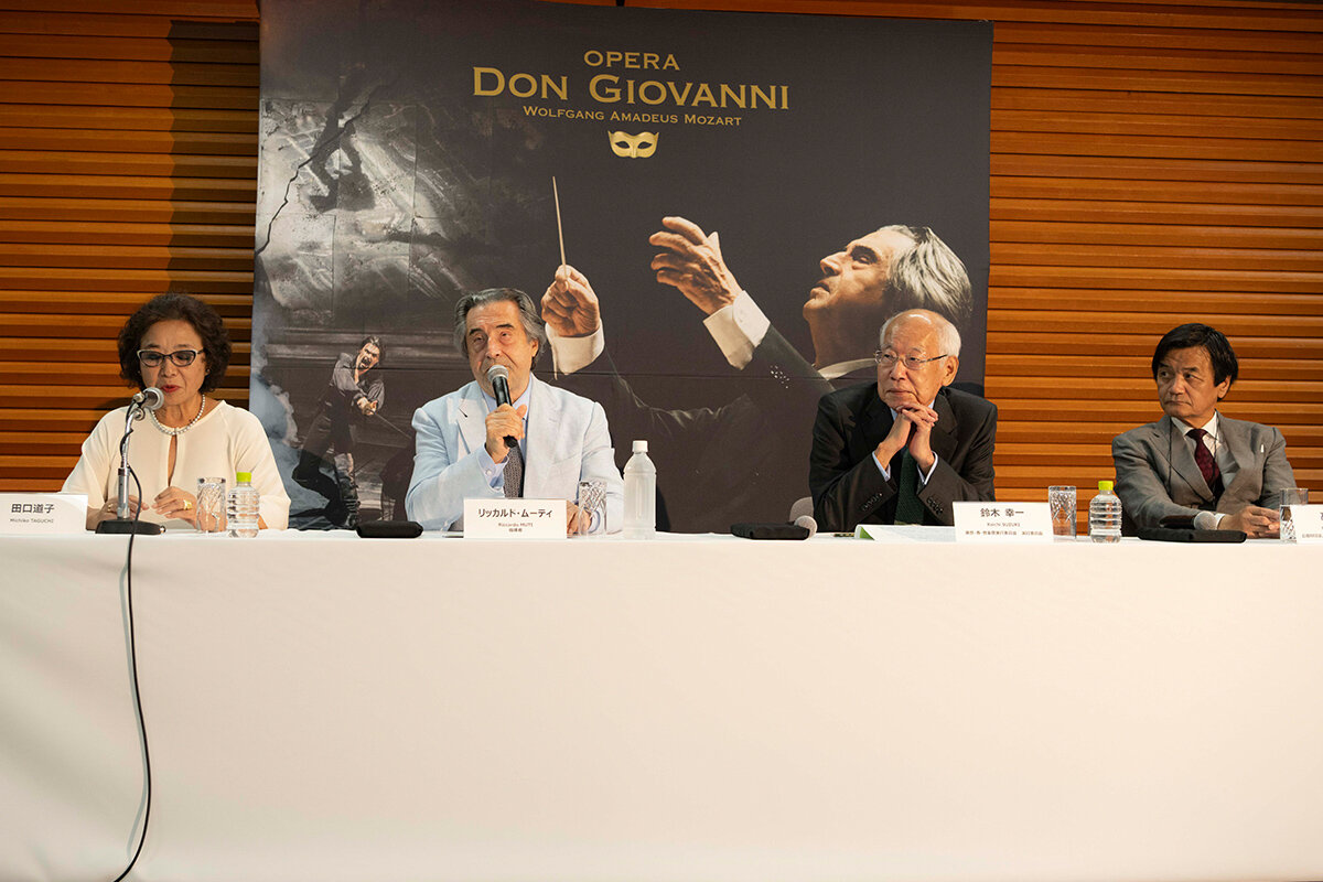 2026年4月〜5月、東京文化会館が長期休館に入る直前のタイミングで、リッカルド・ムーティ指揮による『ドン・ジョヴァンニ』が上演されることになりました。9月10日、「イタリア・オペラ・アカデミー in 東京」で来日中のマエストロを迎えて記者会見が行われました。連日の過密なスケジュールを調整しての開催ではありましたが、マエストロは疲れた様子も見せることはなく、主催のNBS専務理事高橋典夫と東京・春・音楽祭実行委員会委員長鈴木幸一氏と並んだ壇上で、身振り手振りも交えて自身の思いをたっぷりと語りました。