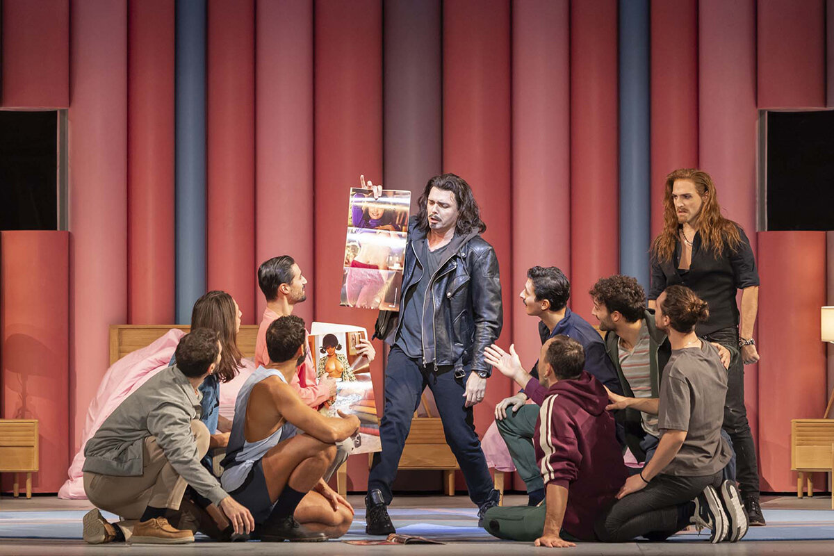 ロバート・カーセンの演出は、「恋人たちの学校」の舞台を現代イタリアの、男女が出会うテレビ番組に置き換えた。アルフォンソとデスピーナが司会者で、多くの男女がバーやプールサイドなどの屋内外で愛を試し合うのだが、こういう状況設定では、演技がぎこちないと見ていられない。だが、ミケレッティもサラも、テレビにこういう形で出演し、ドギマギしながらも大胆不敵さを見せる現代の若者そのものであった。