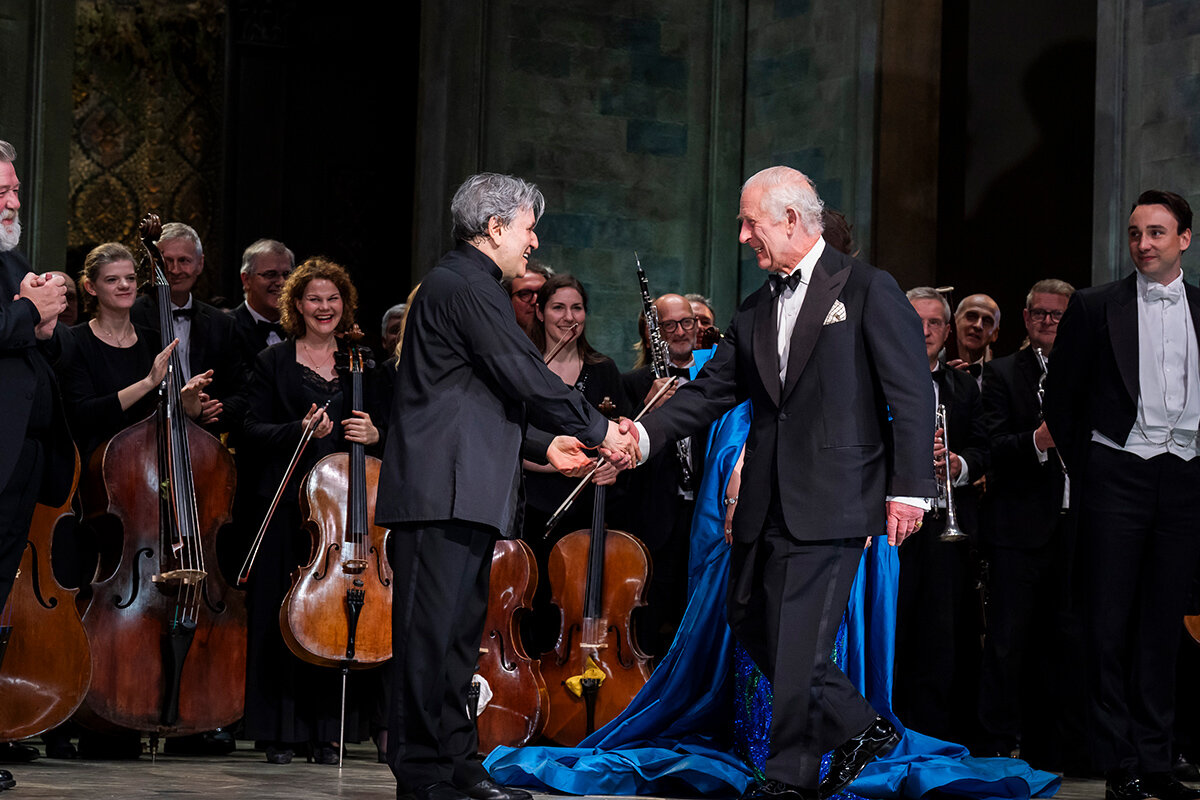 さて、パッパーノを讃えるガラ公演について、ロンドンならではの盛り上がりを見せたニュースが、チャールズ国王の登場でした。ミソとなるのは"ご臨席"ではなく、舞台への"登場"だったこと。国王は、パッパーノや出演歌手たちとともに舞台に登場し熱狂的な拍手で迎えられたとのことです。パッパーノは昨年5月には、チャールズ国王の戴冠式で指揮をとり、国王への賞賛を表しましたが、今回は国王がパッパーノを祝福することとなりました。