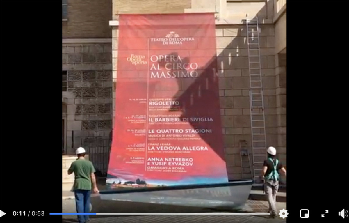 チルコ・マッシモでの公演開催を告げる幕が劇場に掲げられる動画(ローマ歌劇場のFacebookより)