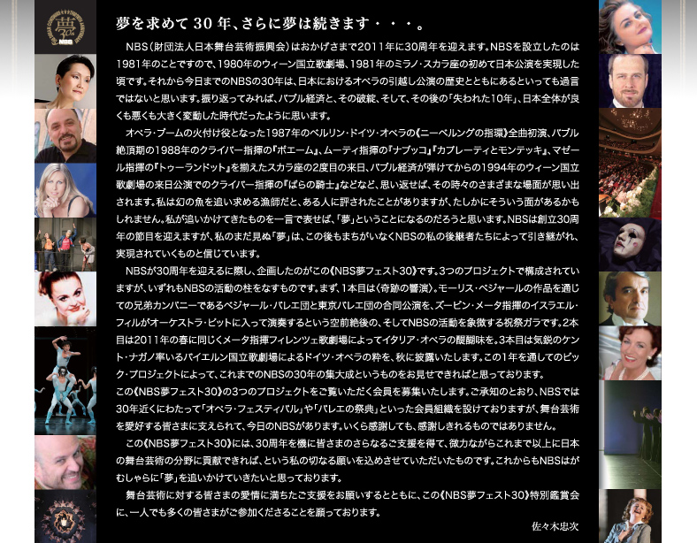 NBS(財団法人日本舞台芸術振興会)はおかげさまで2011年に30周年を迎えます。NBSを設立したのは1981年のことですので、1980年のウィーン国立歌劇場、1981年のミラノ・スカラ座の初めて日本公演を実現した頃です。それから今日までのNBSの30年は、日本におけるオペラの引越し公演の歴史とともにあるといっても過言ではないと思います。振り返ってみれば、バブル経済と、その破綻、そして、その後の「失われた10年」、日本全体が良くも悪くも大きく変動した時代だったように思います。 オペラ・ブームの火付け役となった1987年のベルリン・ドイツ・オペラの《ニーベルングの指環》全曲初演、バブル絶頂期の1988年のクライバー指揮の『ボエーム』、ムーティ指揮の『ナブッコ』『カプレーティとモンテッキ』、マゼール指揮の『トゥーランドット』を揃えたスカラ座の2度目の来日、バブル経済が弾けてからの1994年のウィーン国立歌劇場の来日公演でのクライバー指揮の『ばらの騎士』などなど、思い返せば、その時々のさまざまな場面が思い出されます。私は幻の魚を追い求める漁師だと、ある人に評されたことがありますが、たしかにそういう面があるかもしれません。私が追いかけてきたものを一言で表せば、「夢」ということになるのだろうと思います。NBSは創立30周年の節目を迎えますが、私のまだ見ぬ「夢」は、この後もまちがいなくNBSの私の後継者たちによって引き継がれ、実現されていくものと信じています。 NBSが30周年を迎えるに際し、企画したのがこの《NBS夢フェスト30》です。3つのプロジェクトで構成されていますが、いずれもNBSの活動の柱をなすものです。まず、1本目は〈奇跡の響演〉。モーリス・ベジャールの作品を通じての兄弟カンパニーであるベジャール・バレエ団と東京バレエ団の合同公演を、ズービン・メータ指揮のイスラエル・フィルがオーケストラ・ピットに入って演奏するという空前絶後の、そしてNBSの活動を象徴する祝祭ガラです。2本目は2011年の春に同じくメータ指揮フィレンツェ歌劇場によってイタリア・オペラの醍醐味を。3本目は気鋭のケント・ナガノ率いるバイエルン国立歌劇場によるドイツ・オペラの粋を、秋に披露いたします。この1年を通してのビック・プロジェクトによって、これまでのNBSの30年の集大成というものをお見せできればと思っております。 この《NBS夢フェスト30》の3つのプロジェクトをご覧いただく会員を募集いたします。ご承知のとおり、NBSでは30年近くにわたって「オペラ・フェスティバル」や「バレエの祭典」といった会員組織を設けておりますが、舞台芸術を愛好する皆さまに支えられて、今日のNBSがあります。いくら感謝しても、感謝しきれるものではありません。 この《NBS夢フェスト30》には、30周年を機に皆さまのさらなるご支援を得て、微力ながらこれまで以上に日本の舞台芸術の分野に貢献できれば、という私の切なる願いを込めさせていただいたものです。これからもNBSはがむしゃらに「夢」を追いかけていきたいと思っております。 舞台芸術に対する皆さまの愛情に満ちたご支援をお願いするとともに、この《NBS夢フェスト30》特別鑑賞会に、一人でも多くの皆さまがご参加くださることを願っております。 佐々木忠次