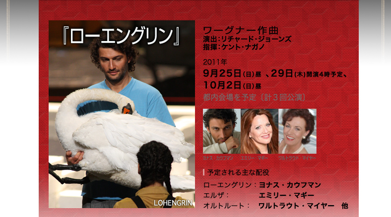 ローエングリン:ヨナス・カウフマン エルザ:エミリー・マギー オルトルート:ワルトラウト・マイヤー 他 R.シュトラウス作曲 『ナクソス島のアリアドネ』 演出:ロバート・カーセン 指揮:ケント・ナガノ