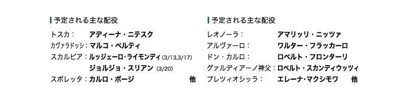 トスカ:アディーナ・ニテスク カヴァラドッシ:マルコ・ベルティ スカルピア:ルッジェーロ・ライモンディ(3/13,3/17) ジョルジョ・スリアン(3/20) スポレッタ:カルロ・ボージ 他 ヴェルディ作曲 『運命の力』 演出:ニコラ・ジョエル 指揮:ズービン・メータ